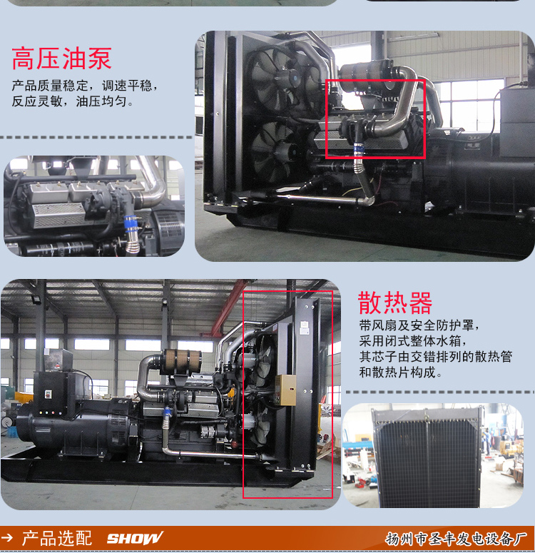 揚州市圣豐發(fā)電設備廠由業(yè)內(nèi)資深的30余名青年工程師團隊傾力打造,專業(yè)從事通用汽、柴油、燃氣發(fā)動機及其終端產(chǎn)品的研發(fā)和生產(chǎn)。是研制節(jié)能變頻發(fā)電機組、發(fā)電電焊兩用機、低噪音柴油發(fā)電機組、全自動柴油機發(fā)電機組,4輪3輪2輪移動電站柴油發(fā)電機組,選用柴油機品牌有:沃爾沃、康明斯、強鹿、大宇、道依茨、上柴、濰柴、濟柴、無動、帕歐等。發(fā)電機可選擇品牌:無錫斯坦福、上海馬拉松、蘭電、蘇州德鋒(凱捷利)、上海斯坦福、廣州英格、利萊森瑪、西門子發(fā)電機等。以‘圣豐’為主導品牌的產(chǎn)品集各家之所長,技術(shù)領(lǐng)先,匹配合理,美觀大方,性能卓越!準確的市場和產(chǎn)品定位,最優(yōu)化的性價比,精明著客戶的選擇。廣泛應用于國內(nèi)外各大行業(yè),如工廠、酒店、房地產(chǎn)、樓宇、鐵路、石油、礦山、電信系統(tǒng)等。自主研發(fā)成套的柴油發(fā)電機組具有先進的四保護、自啟動自切換、計算機遠程監(jiān)控等功能,功率覆蓋3KW-3000KW。各功率段均可提供標準機組、靜音機組、車載及拖車機組和并機柜等,并可實現(xiàn)固定式、移動式、自動化、低噪音、多機并聯(lián)、應急電源車等多種供電方案。同時可為客戶提供機組容量選型、機房設計、技術(shù)安裝指導和調(diào)試等專業(yè)服務。